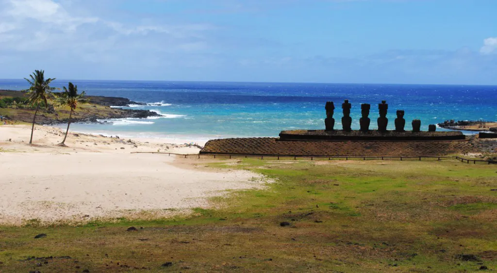 Los que piensen que en Rapa Nui (Isla de Pascua) abundan las playas, van muy equivocados. La isla es de origen volcánico y bien agreste, repleta de acantilados… a excepción de Anakena. Un remanso de arena fina, palmeras y aguas cristalinas y tibias. Pero no sería del todo especial si no fuera por su cercano «ahu», plataforma ceremonial con siete moáis, cuatro de ellas con «pukao», el tradicional sombrero de piedra de las figuras.