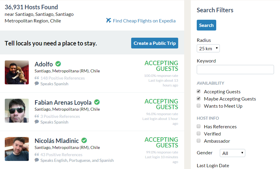 Una vez completado, ya puedes ofrecer tu casa para viajeros o empezar a buscar personas que te alojen en tu siguiente viaje. Puedes filtrar por edad, sexo, últimas conexiones…. Al tratarse de una red de confianza es importante que te crees una red de amistades y que si alojas o te alojan dejen una recomendación. Transmite más credibilidad una persona con comentarios de terceros.