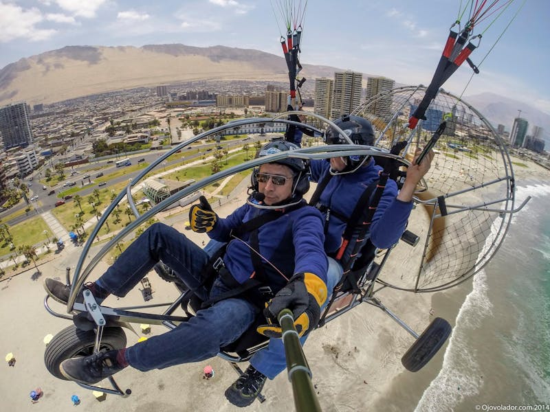 El vuelo es el momento de relajarse y disfrutar. Tendrás una vista de pájaro de 360 grados, sin cristales o mamparas que se interpongan en el panorama, sintiendo la brisa en tu rostro. Si lo haces en Iquique, la meca de este tipo de vuelos en Chile, puedes saborear cómo la luminosa ciudad se abre paso entre gigantescas dunas y el Pacífico brillante. Un espectáculo así es como para compartirlo y comentarlos, por este motivo los cascos están equipados con intercomunicadores para posibilitar conversaciones entre los dos pasajeros y darse instrucciones.