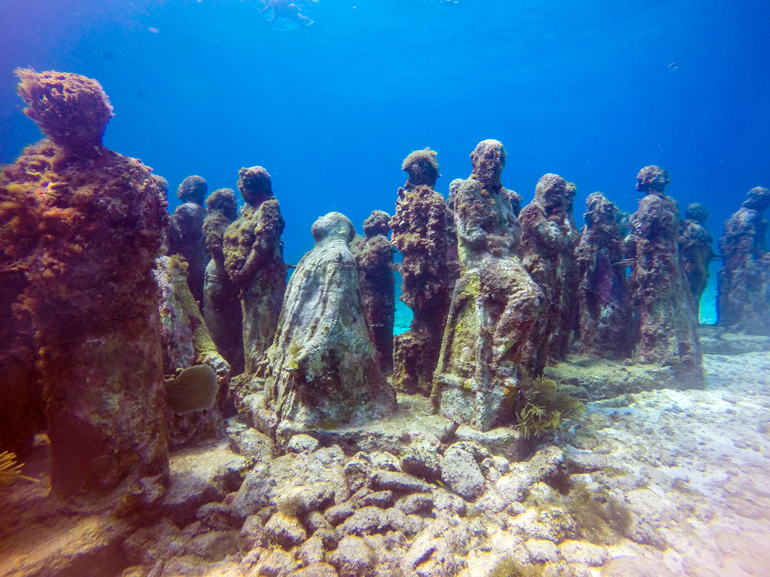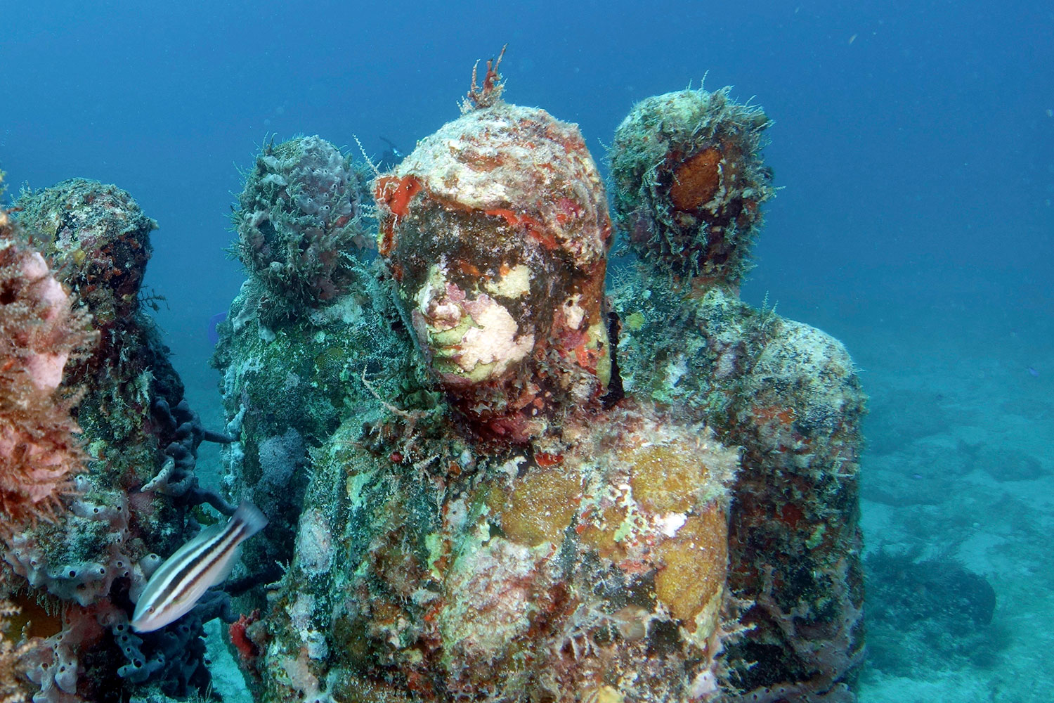 Durante el tour Snorkel con Tortugas y Museo Submarino, navegarás hacia áreas de arrecife donde verás peces tropicales, tortugas, mantarrayas, langostas y crustáceos. También visitarás el Museo Submarino de esculturas bajo el mar.