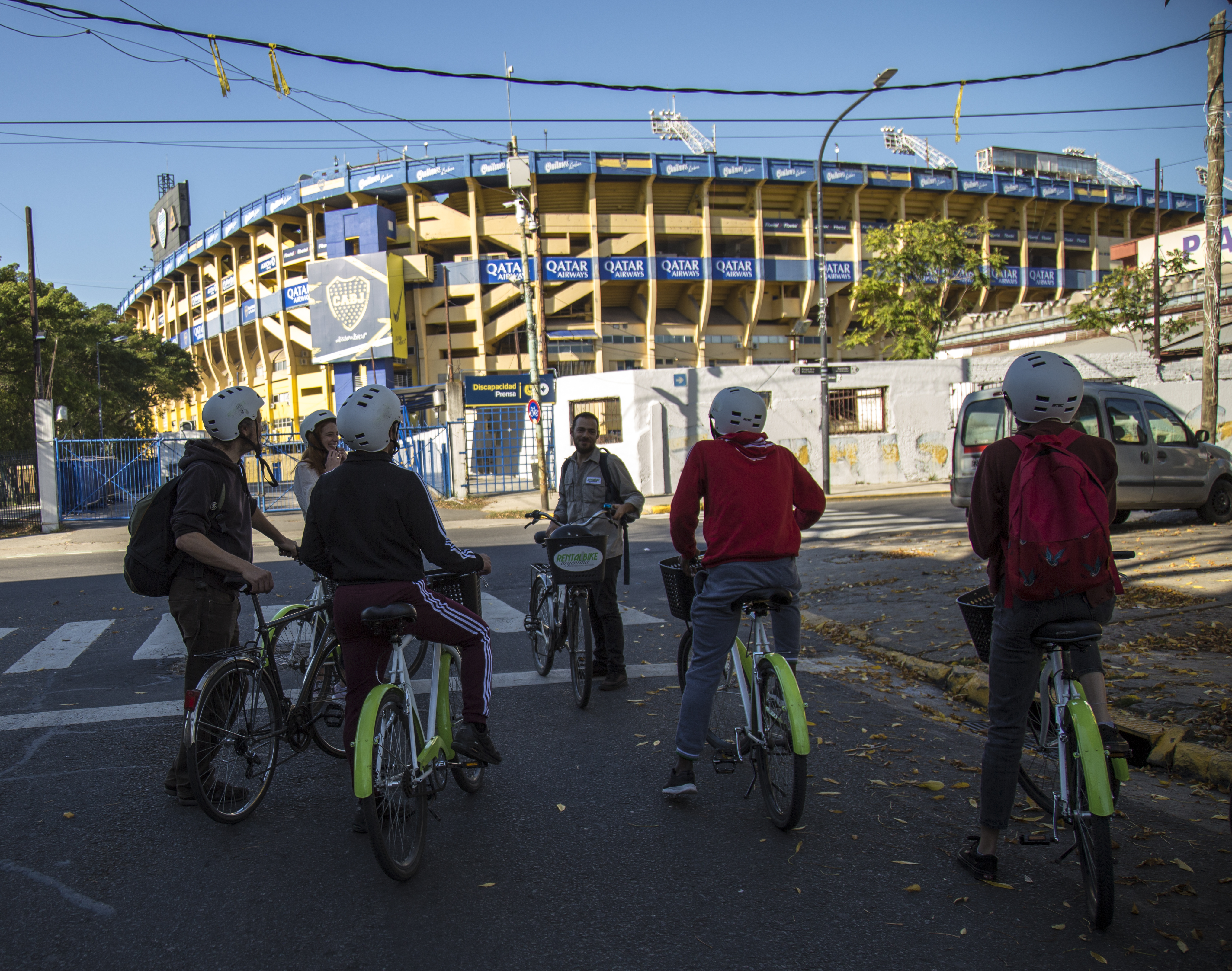 bilingual guide (Spanish and English), helmet and bicycle.